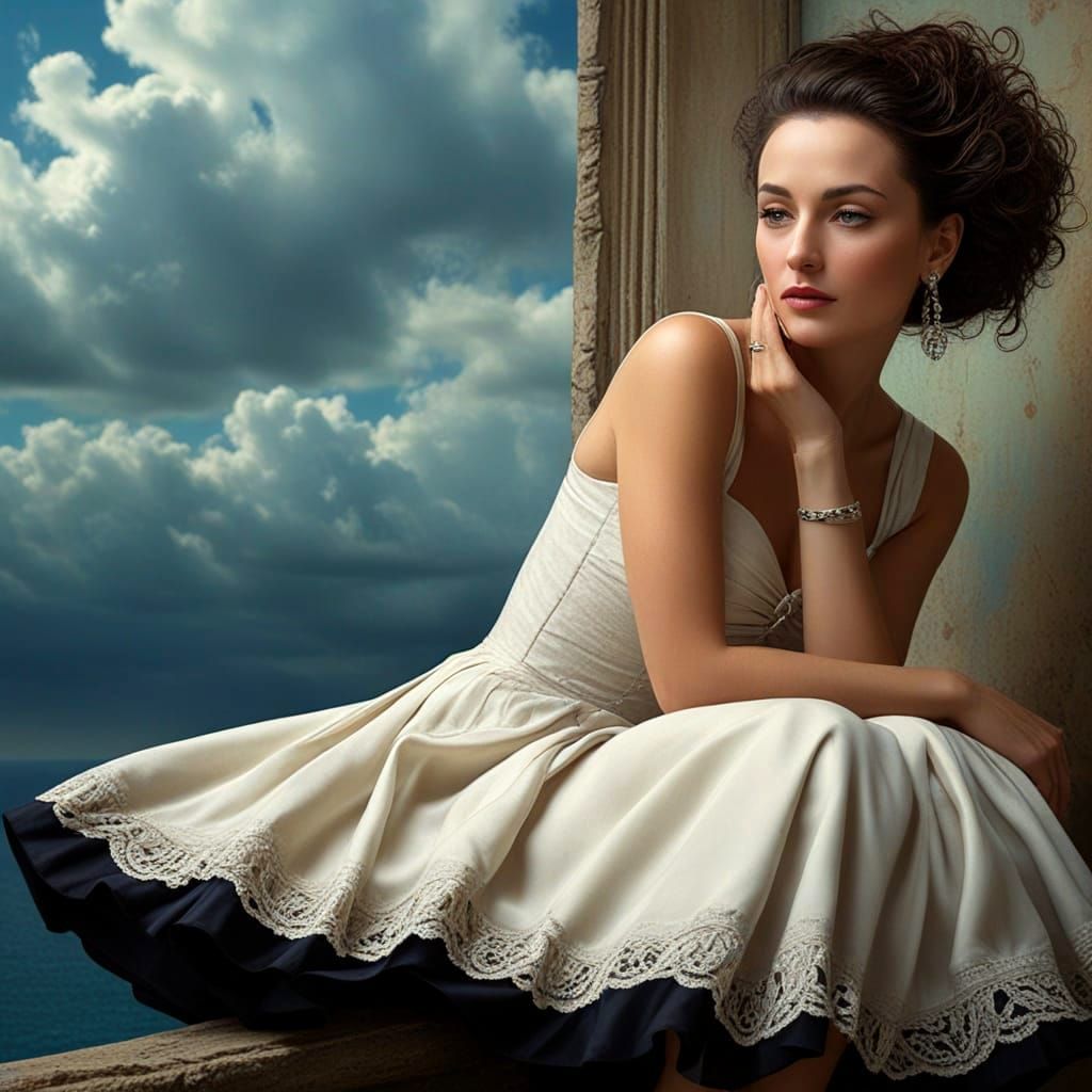 surrealistic full-height image of a charming elegantly dressed 40-year-old lady, photographically rendered beautiful face, open warm expression, graceful natural dynamic posture, in fantastic surreal surroundings against stunning fantastic surrealistic background by Andy Kehoe, Salvador Dali, Catrin ...