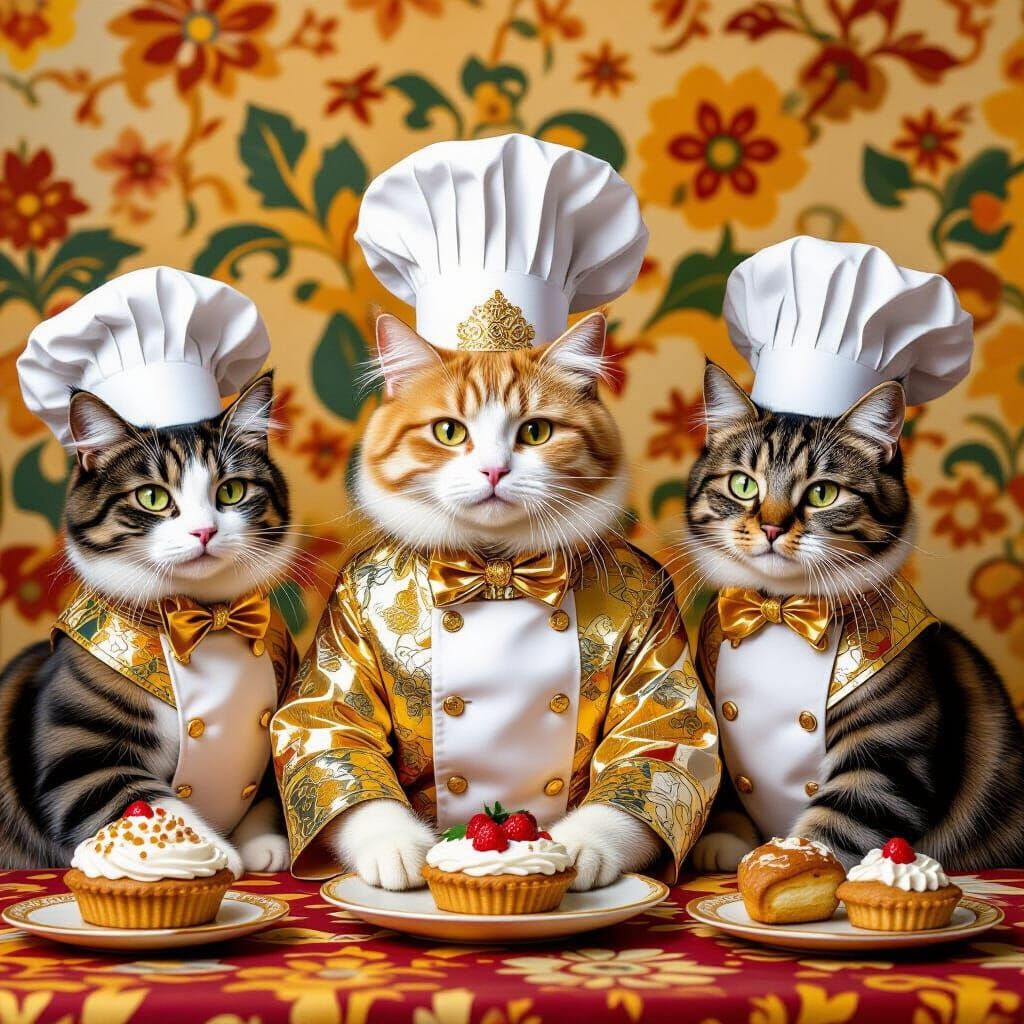 This image shows a team of cats working as pastry chefs, with one cat resembling Donald Trump as the head chef, all in golden Klimt-inspired outfits, against an art nouveau wallpaper. It is rendered as vibrant abstract digital art.