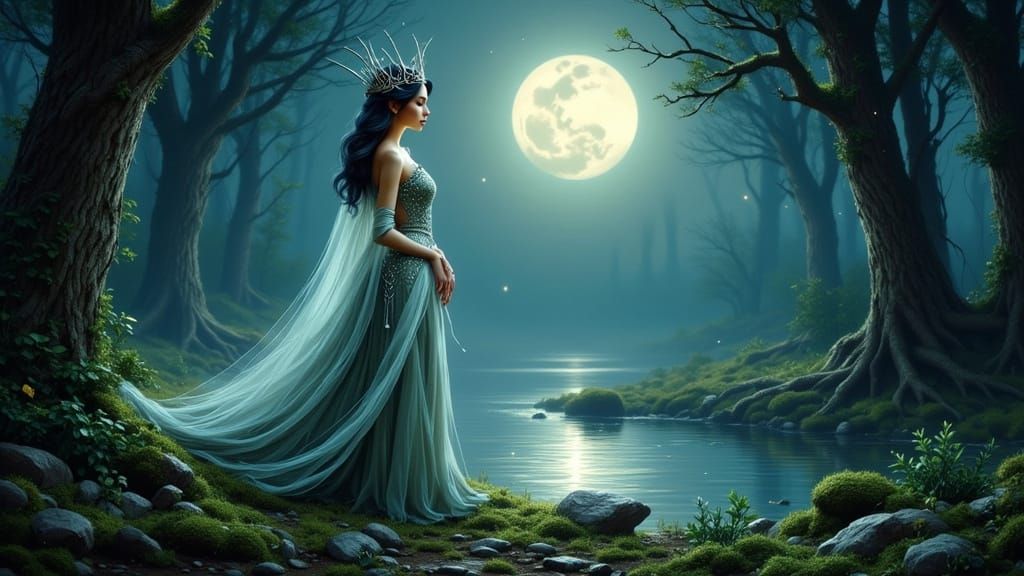A regal Fey Queen stands in a moonlit forest, adorned with a crown of branches and gems. Her mist-like veil and flowing gown evoke ancient woodland magic. Rendered with painterly cinematic realism.