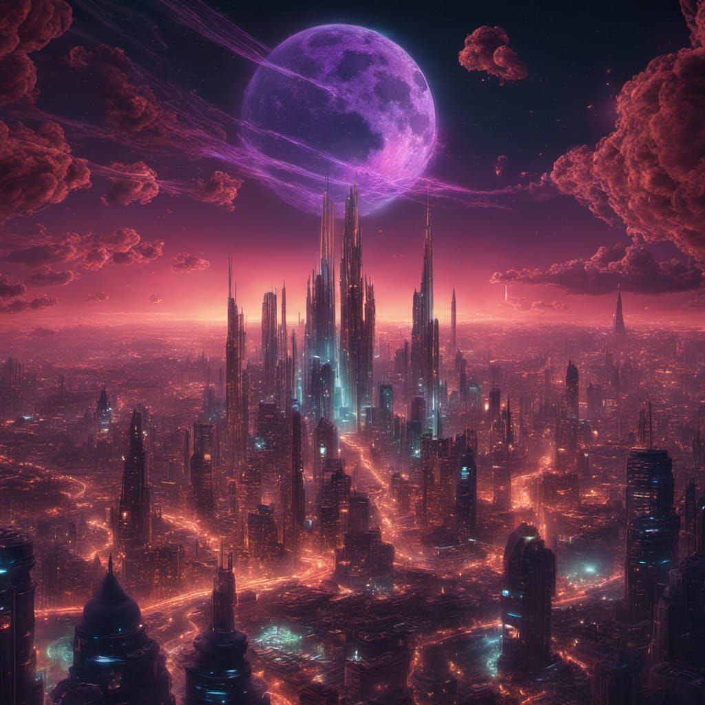 This image shows a futuristic city professionally engraved on a metal plate. The city is depicted in neon font against a lunar night sky, rendered as detailed matte painting.