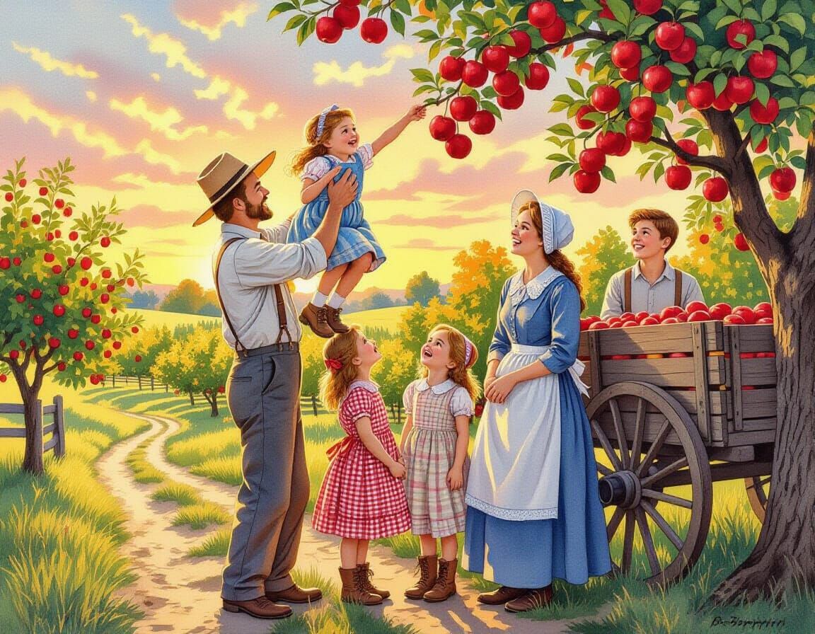 A vibrant watercolor painting captures a joyful family of five harvesting apples at sunset, set in a lush orchard with a wagon full of fruit.