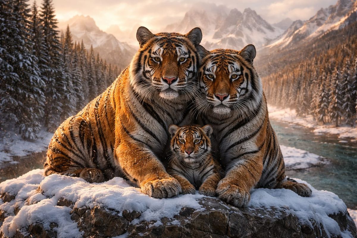 This striking image captures a tiger family—two adults and a small cub—huddled closely together on a snow-dusted rocky outcrop. Set against a breathtaking backdrop of jagged, sunlit peaks and a winding river, the scene evokes a sense of majestic tranquility and familial protection in a frozen wilderness.