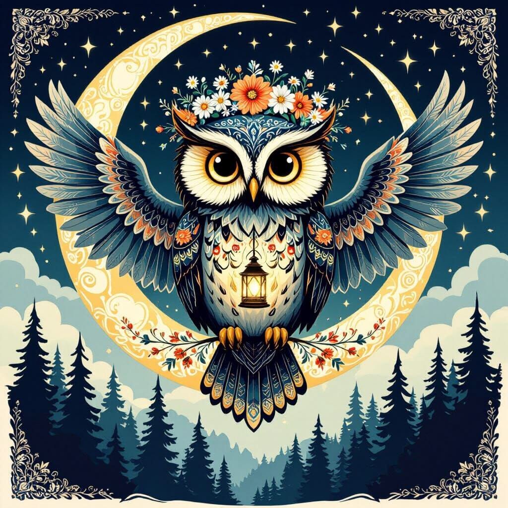 A striking picture of a wise owl with glowing eyes, perched on a moonlit forest. The owl wears a wildflower crown and holds a lantern, its wings adorned with folk patterns, in a fantasy art style.