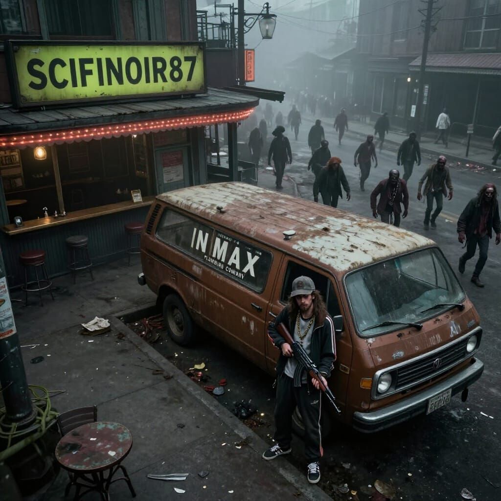 A bird's-eye view of a foggy, derelict boulevard with decaying cafes and a casino. A lone survivor with an AK-47 stands by a grimy van amidst a zombie horde. Cinematic lighting and gothic atmosphere.
