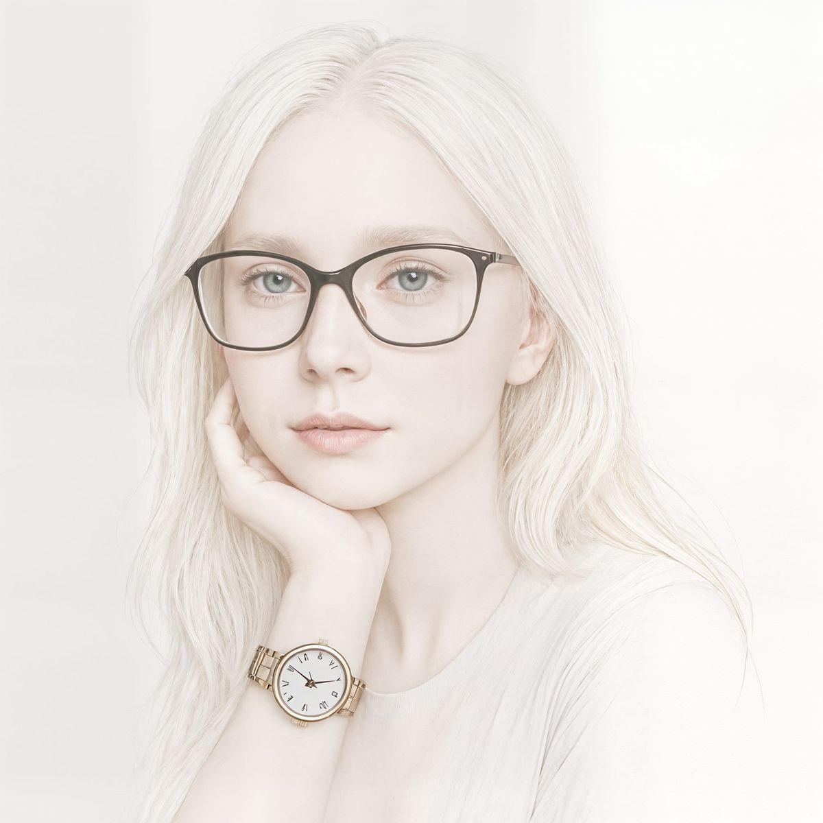 A close-up image of a girl with striking albino blond hair wearing glasses. The subject is accessorized with a beautiful wrist watch.