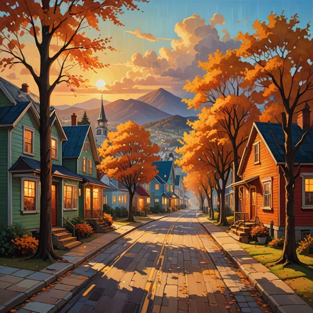 An oil painting depicting a quaint coastal town street descending to the water during a warm sunset. Colorful houses with glowing reflections line the road, set against distant hills and calm water.