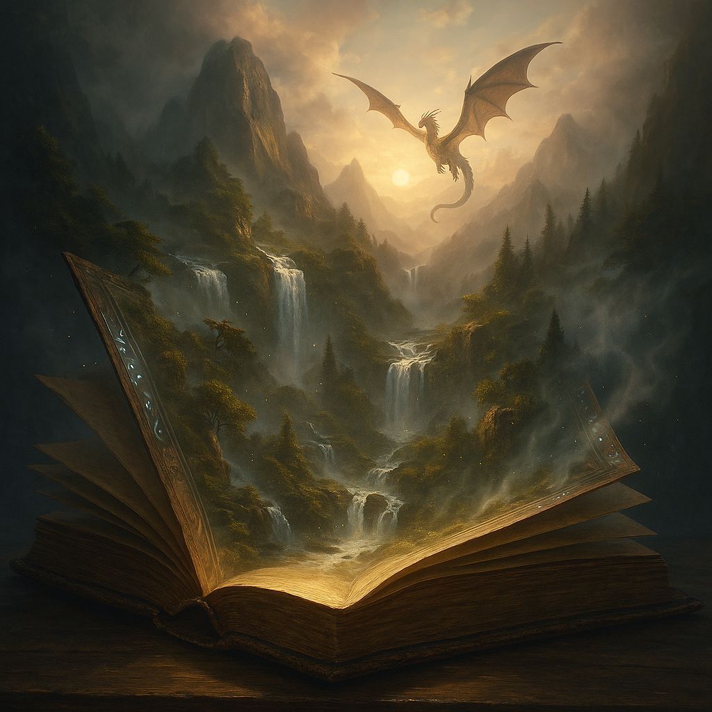 This image shows a fantasy landscape with dragons and glowing runes rising from an open, ancient book. Rendered with cinematic realism and ethereal color grading.