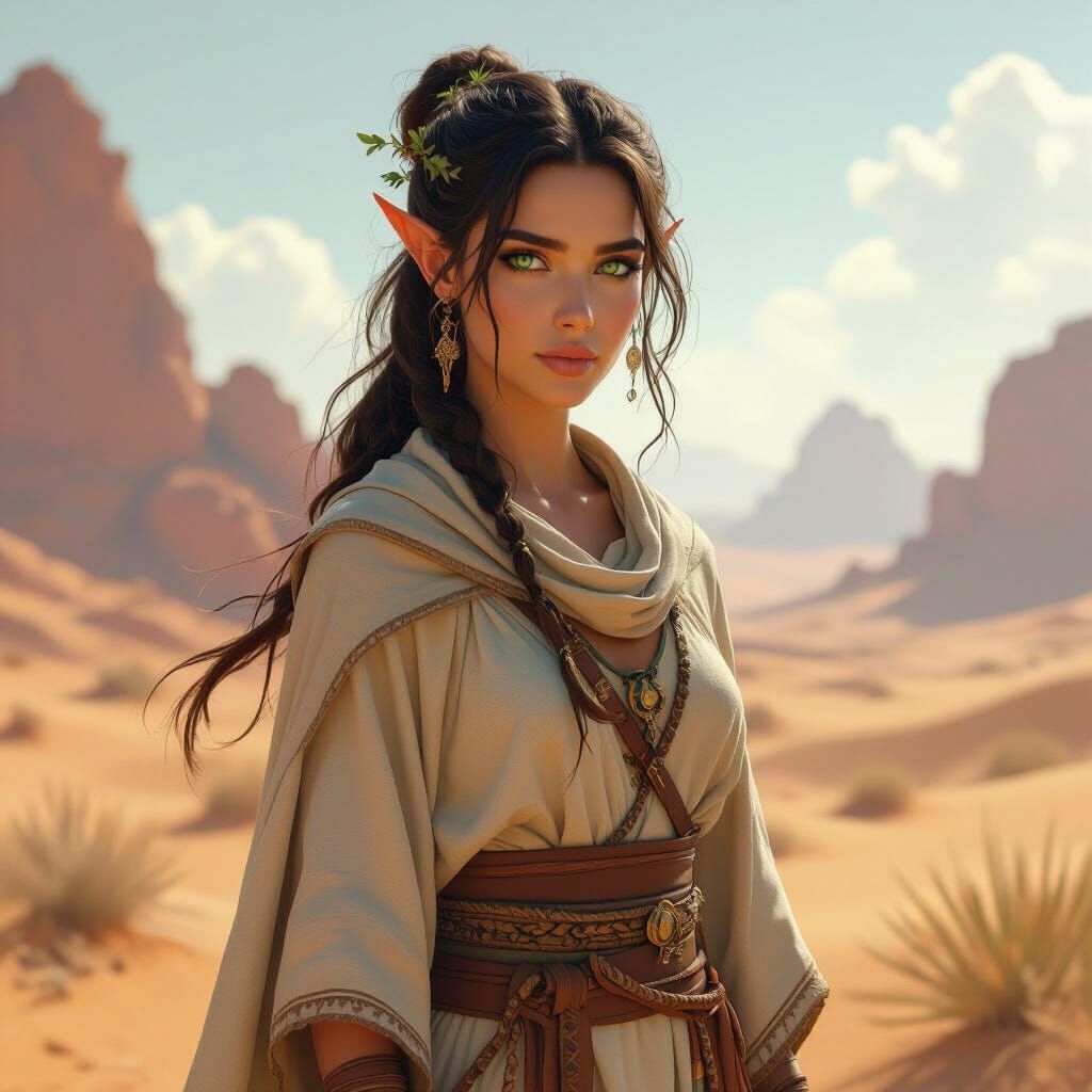 Race: Elf (Wood Elf) Appearance: Aysha is a striking woman with rich brown skin and emerald green eyes that gleam with curiosity and intelligence. Her long hair is the color of dark oak and is tied back with woven desert vines. She wears a light robe that covers most of her body, but it’s practical and made of breathable, durable fabric to protect her from the sun. Around her neck is a small pouch of herbs and vials filled with rare desert tinctures. Her fingers are often stained with the colors of the plants she gathers, and a quiet aura of calm wisdom surrounds her.