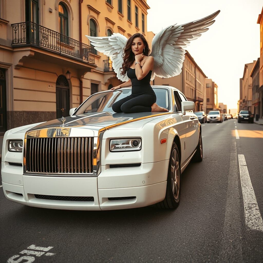 A hyperrealistic image shows a woman with angel wings in a black dress sitting on a white Rolls Royce Phantom. The golden hour lighting enhances the car's details against an urban backdrop.