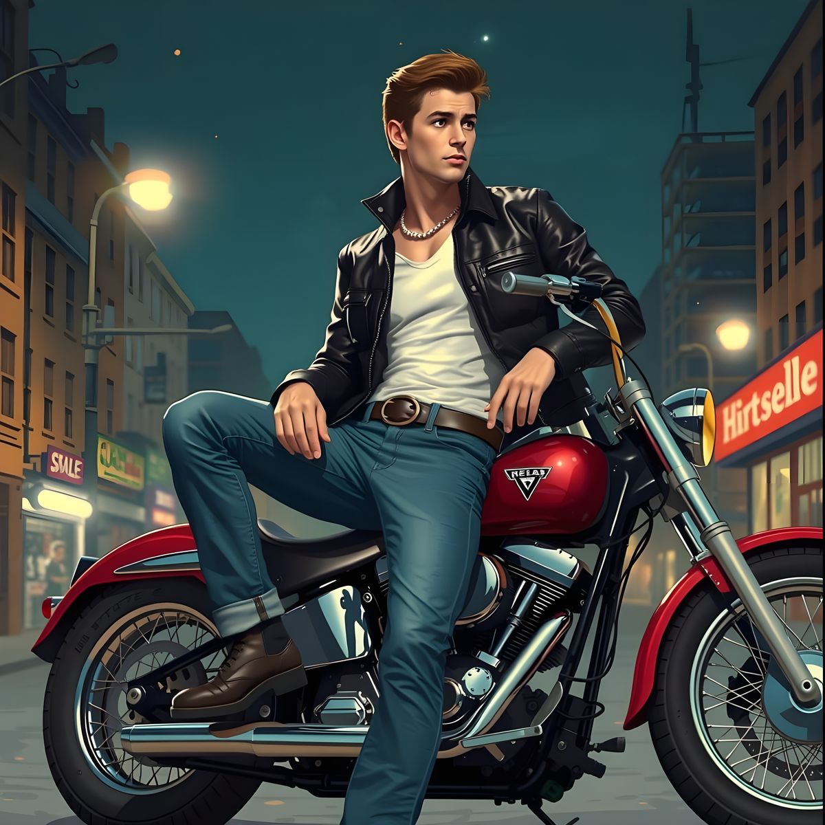 This image shows a young man with a pompadour and leather jacket leaning on a motorcycle in a 1950s greaser style. The scene is lit with cinematic lighting and vibrant Kodachrome colors, reminiscent of mid-century men's fashion.