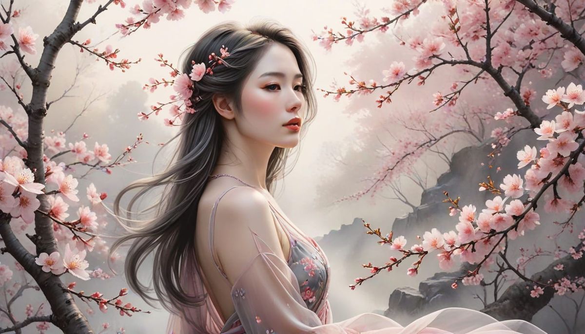 This image features an elegant figure with delicate features, partially hidden by cherry blossoms. It combines ink lines and watercolor washes with pink and grey tones for a serene, mysterious beauty.