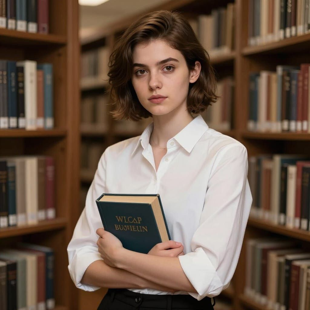 A hyperdetailed portrait of a young woman with brown hair and eyes, holding a book in a library. Created with dynamic lighting and triadic colors for a stunning visual.