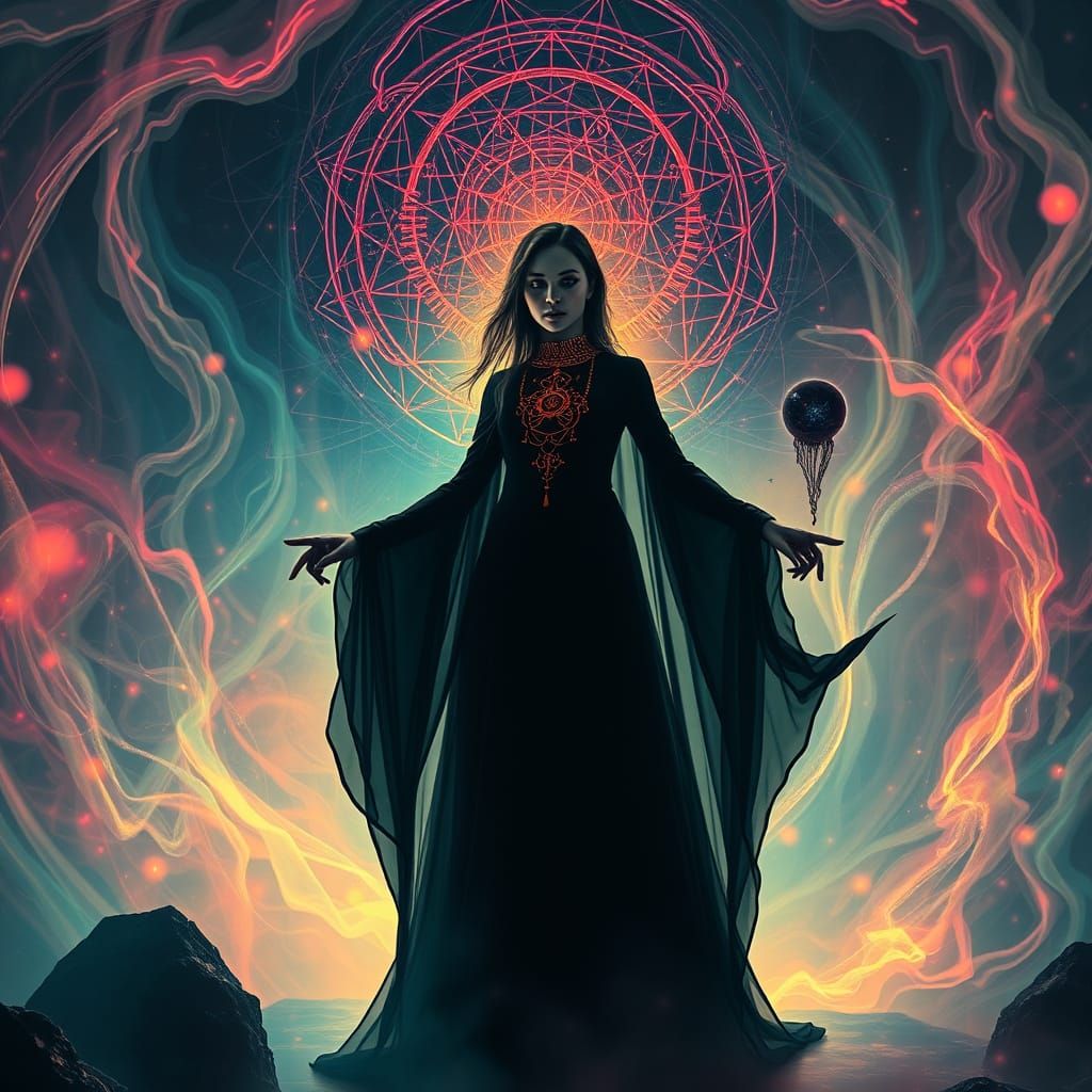 A mysterious woman in flowing black attire is surrounded by swirling neon lights and geometric patterns, creating a surreal, hallucinatory atmosphere with occult symbolism.