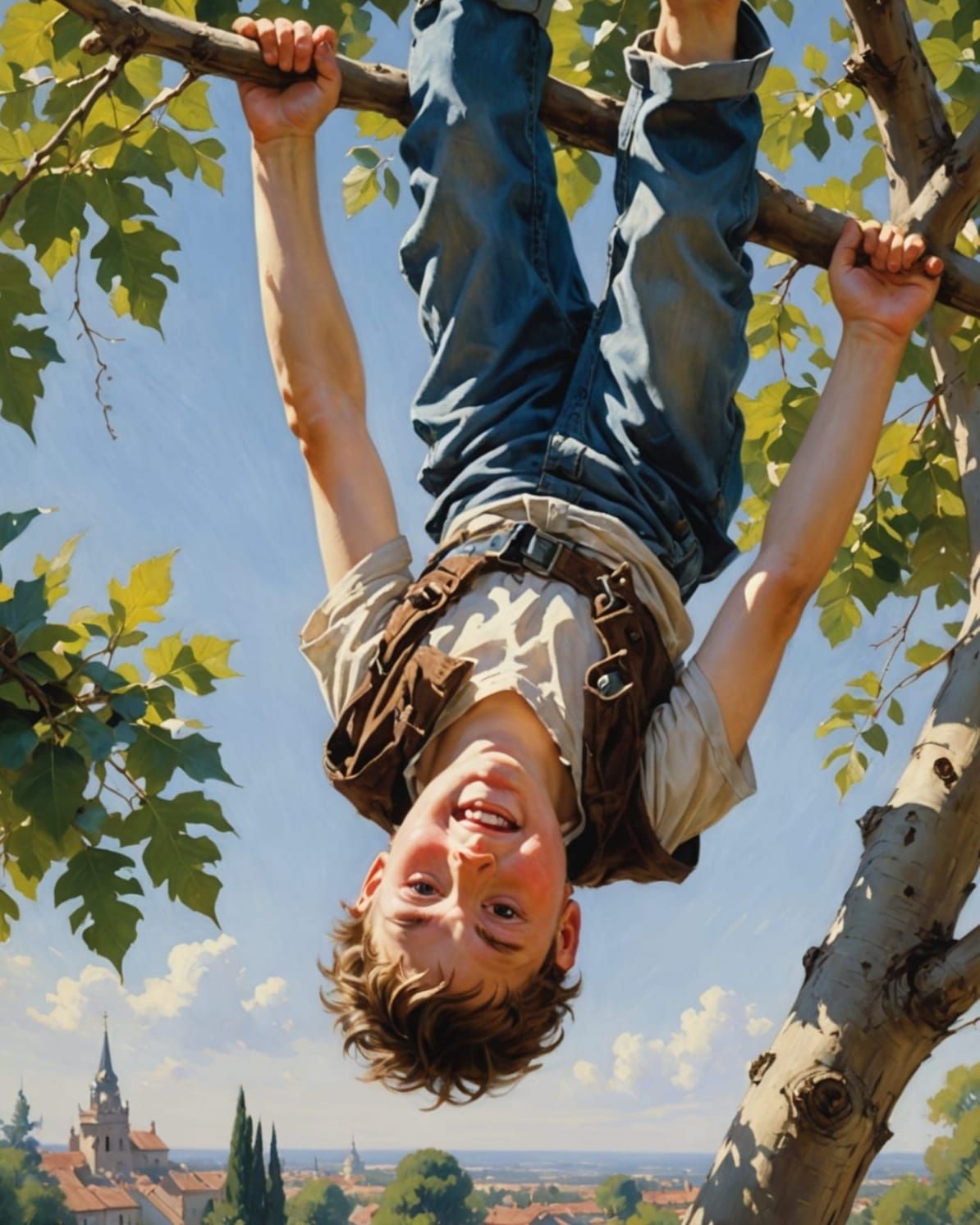 This hyper-detailed image shows a laughing boy hanging from a tree branch. The art style is elegant and intricate, with realistic eyes and accurate anatomy.