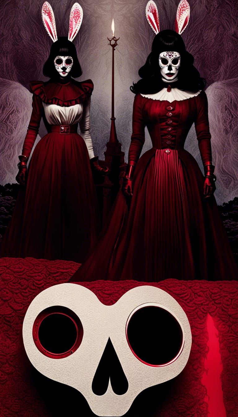 A surreal image of a rabbit surrounded by gothic horror elements. The artwork evokes a dark fantasy aesthetic with iridescent colors, violent themes, and a retro crime scene atmosphere.