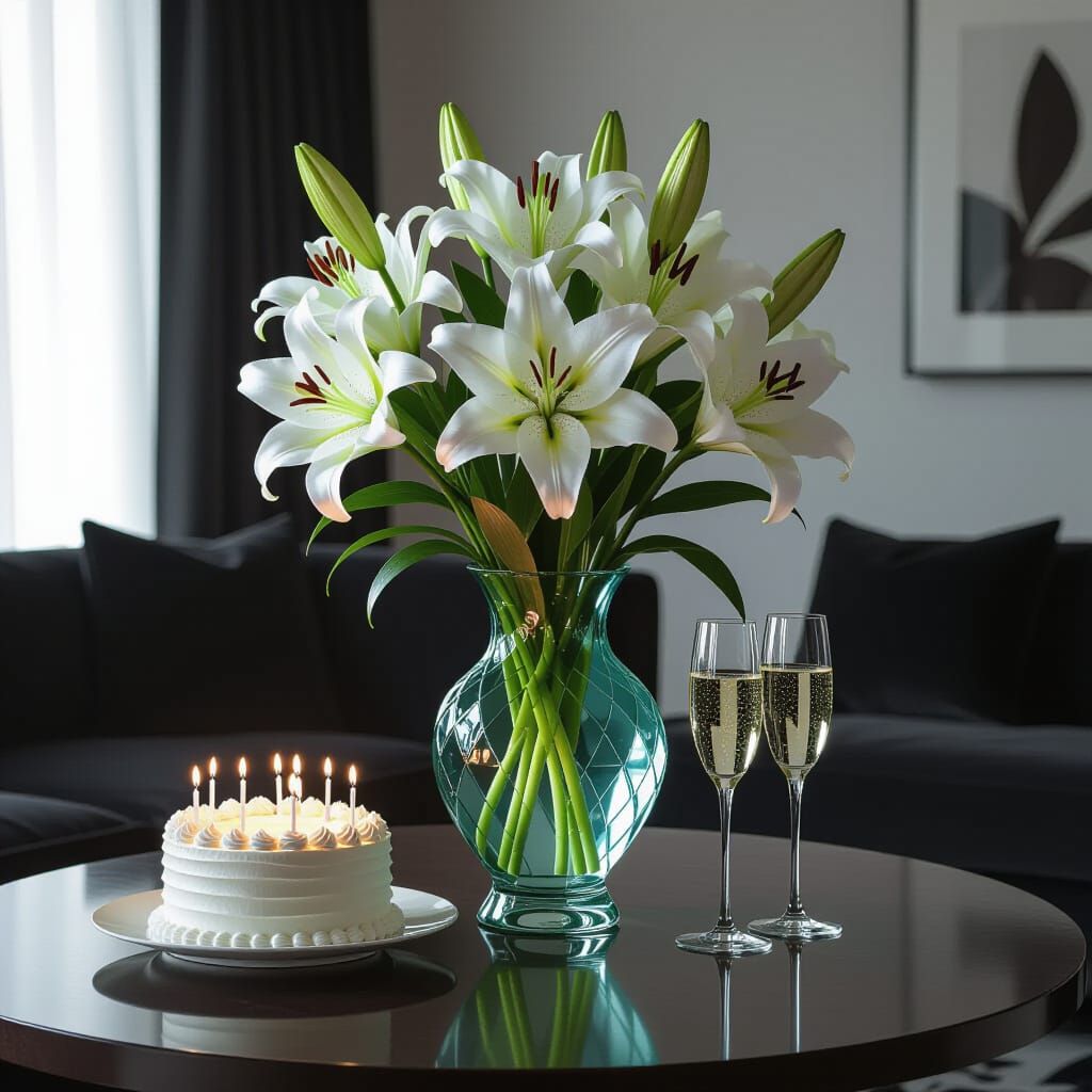 A chic black and white scene featuring stargazer lilies in a seafoam glass vase, a birthday cake with 67 candles, and champagne glasses. Photographed in a dramatic, sharp focus editorial style.
