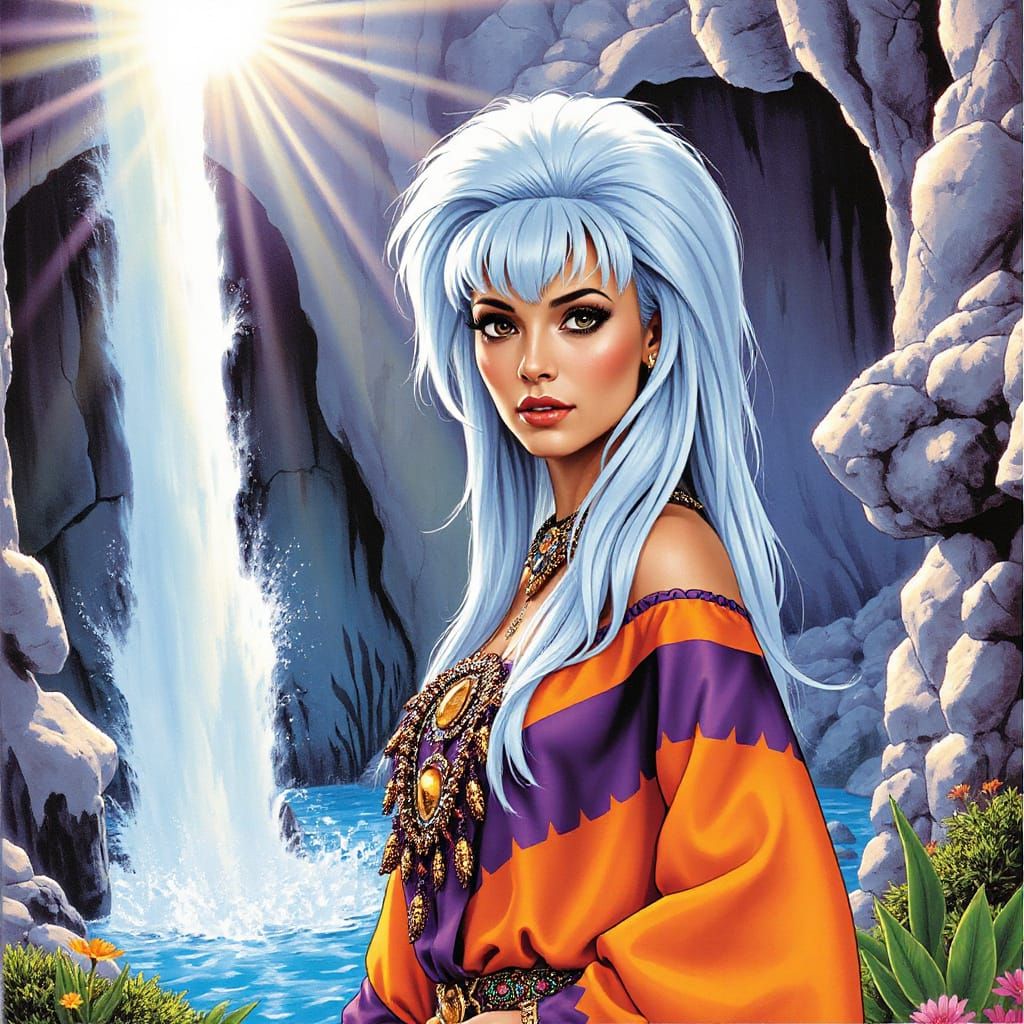 This image showcases a detailed, comic book-style illustration of Queen Kidagakash standing next to an Atlantean waterfall, surrounded by lush botanical details and vibrant colors.