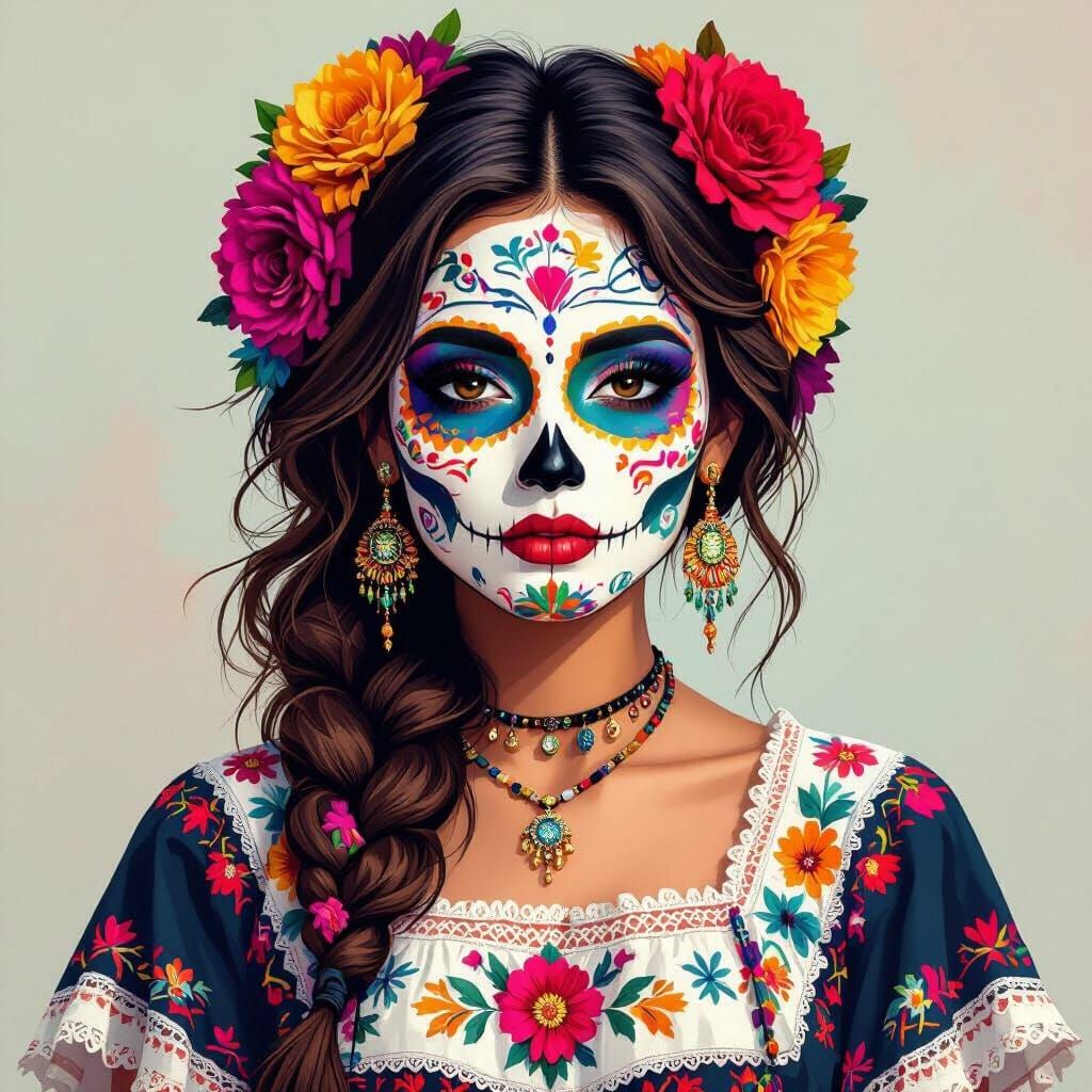 A striking picture of a brunette woman with vibrant sugar skull face paint and a traditional Mexican dress. The image is reminiscent of expressive digital painting with rich, jewel-toned colors.