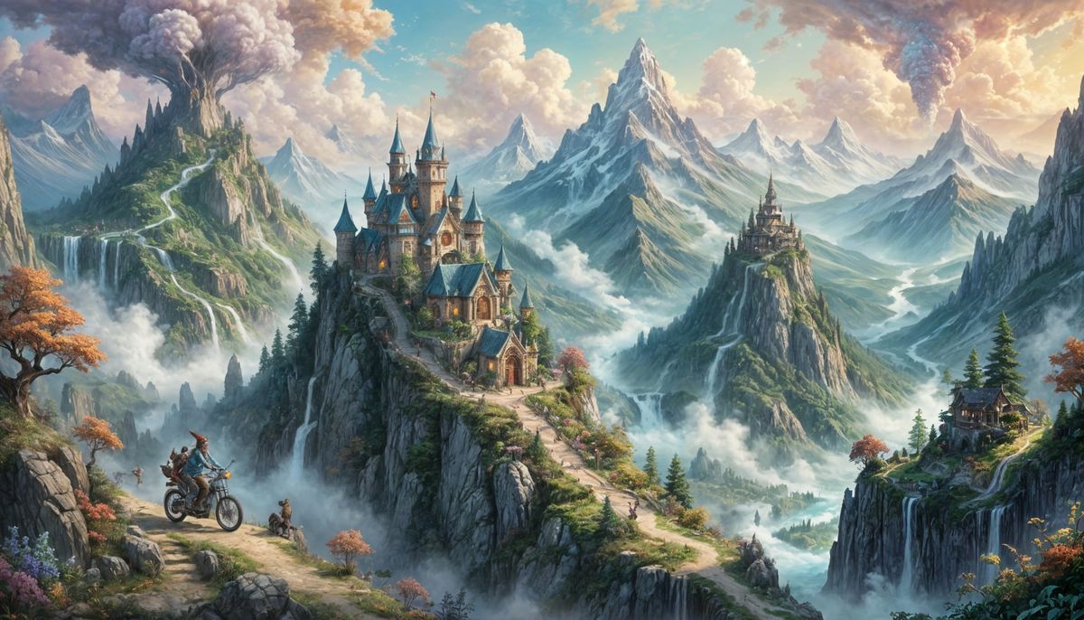 A whimsical watercolor of a fantastical landscape featuring popcorn dragons and gnomes on motorcycles. This detailed fantasy concept art showcases lush vegetation and towering mountains in soft, pastel colors.