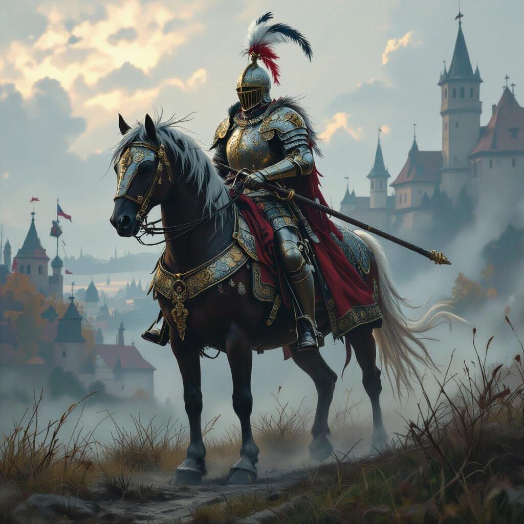 A striking picture of a Polish Hussar knight in elaborate armor with feathers and wings, holding a lance. The knight's armor is reminiscent of 19th-century Polish historical paintings.