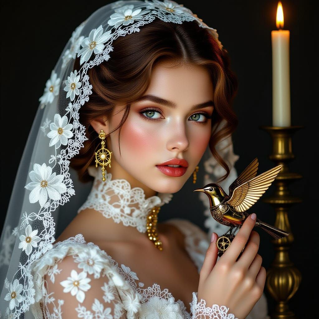 A striking picture of a young woman with porcelain skin and an ornate lace veil. She holds a mechanical bird with golden gears in cinematic lighting, reminiscent of photorealistic Renaissance portraiture.