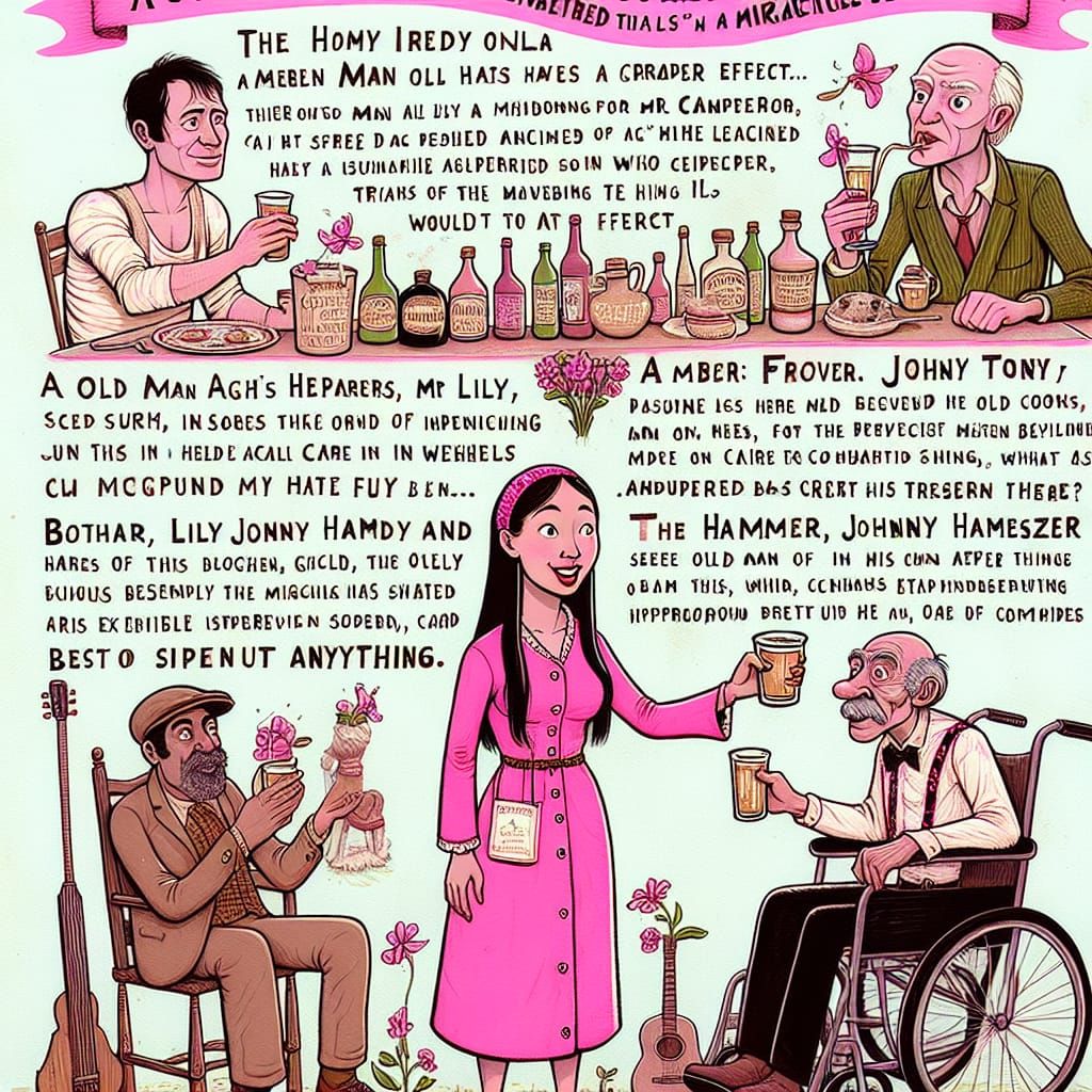 This image portrays a cheerful celebration scene featuring diverse characters. They are toasting Lily, a Hispanic inventor in pink, whose medicinal compound has brought miraculous transformations. A whimsical and heartwarming illustration.