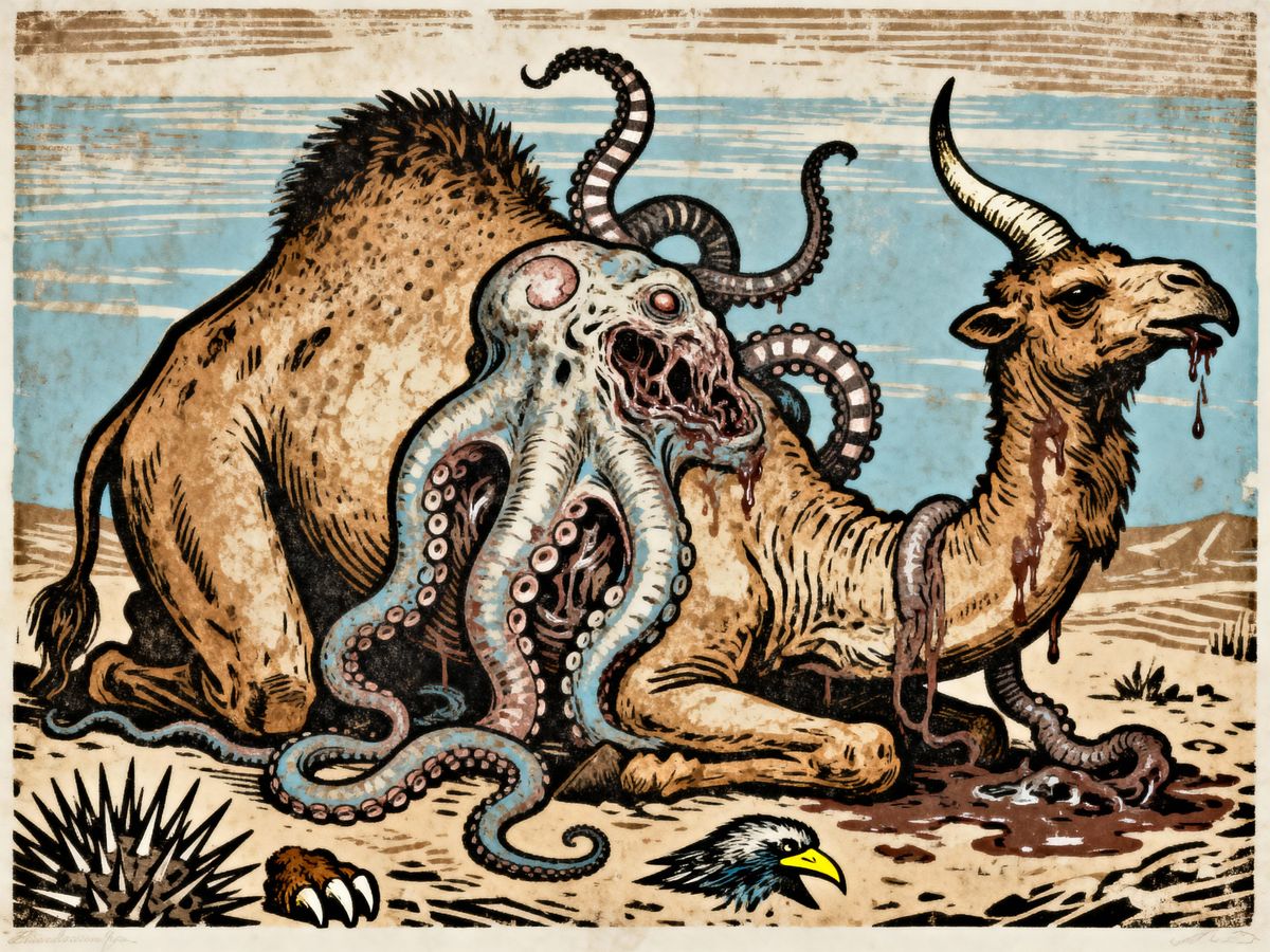 This image depicts a shocking mutant zygote with animalistic features, created in a faded woodcut printing style with striped and dotted textures.