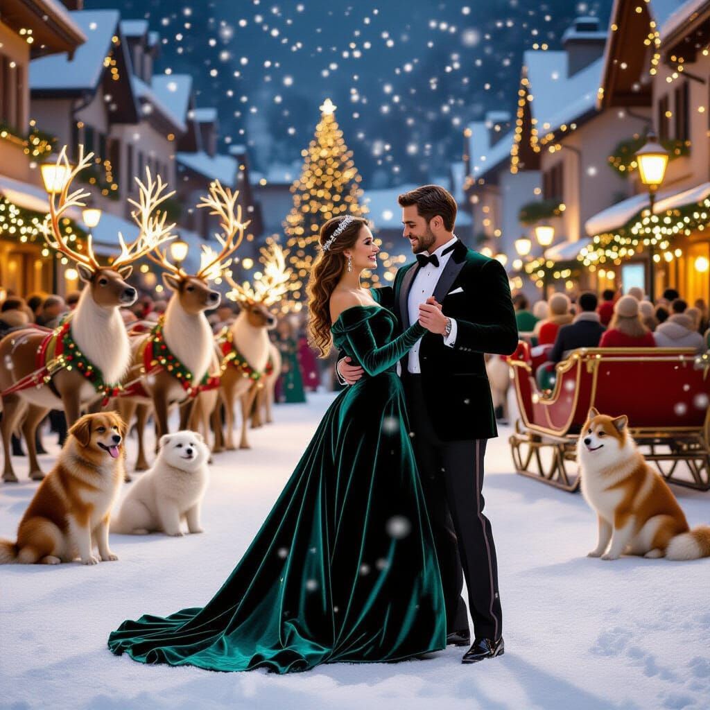 This image depicts a couple dancing in a snowy village square filled with festive lights, reindeer, and animals. Rendered in a detailed, painterly style with a warm, magical glow.
