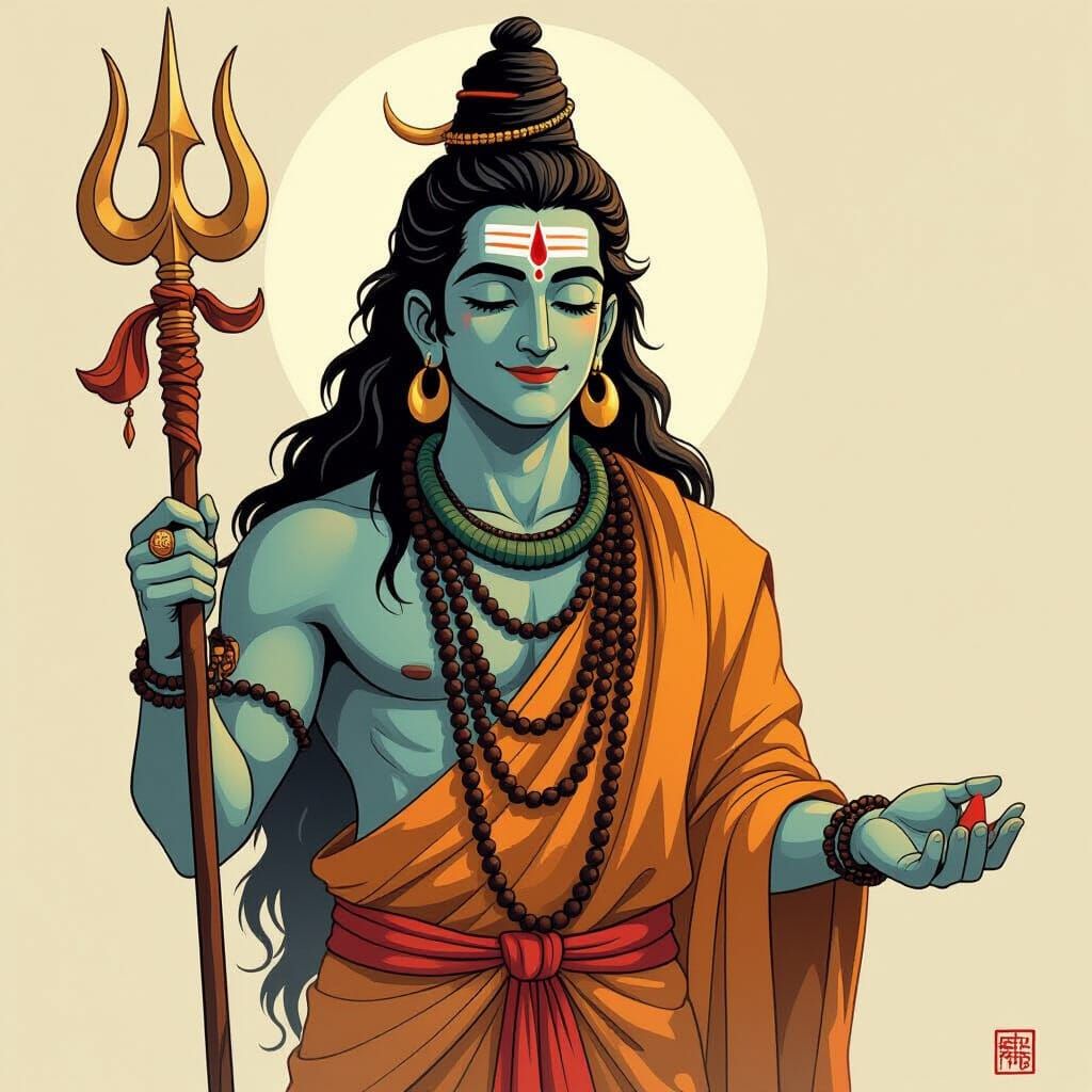 A serene depiction of Lord Shiva in earthy robes, resting on his trishul. This image evokes a sense of divine realism with muted tones, reminiscent of Ghibli-style animation.