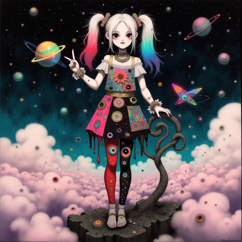 This image shows a confident Harley Quinn standing in a surreal, ethereal realm surrounded by clouds, stardust, and orbiting planets. Her vibrant costume features zodiac symbols and astrology-inspired accents, blending digital glitch textures with traditional media roughness.