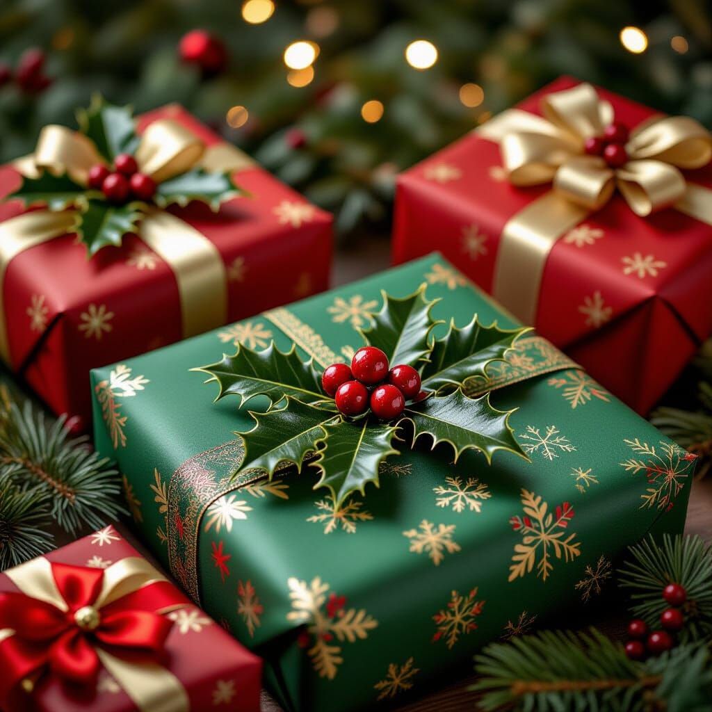 This photorealistic image showcases beautifully wrapped Christmas presents. Gifts feature red and green paper, holly sprigs, and silk ribbons, captured with studio lighting and a shallow depth of field for a festive atmosphere.