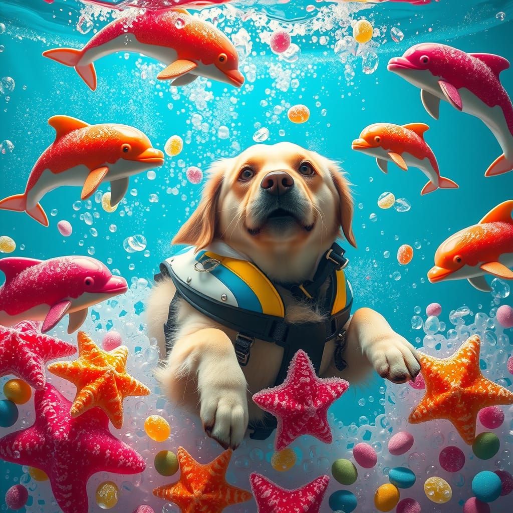 A whimsical image shows a golden retriever swimming in a fizzy soda sea. Colorful gummy dolphins, sugar starfish, and hard candies create a surreal, dreamlike scene with pop surrealism elements.