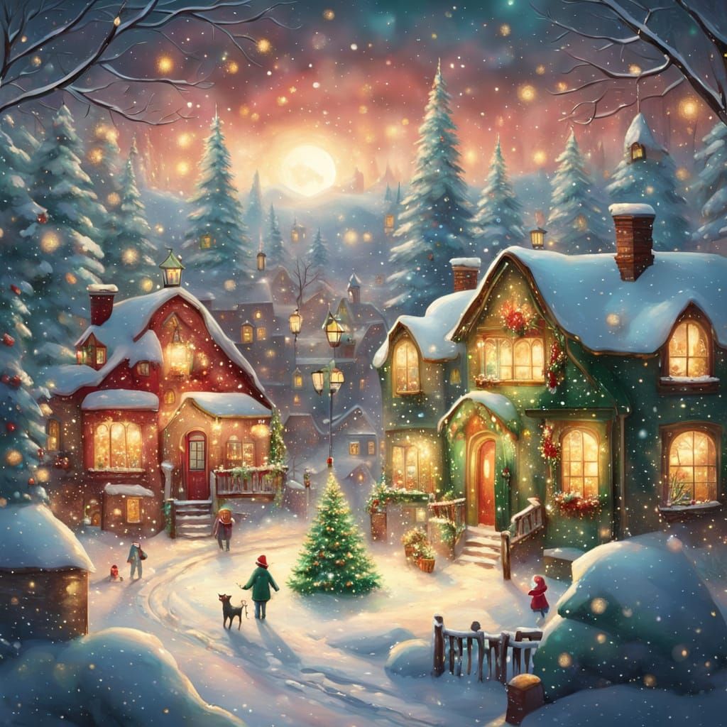 A beautiful Christmas village with glowing snow balls and small children running around with lights on Christmas green pine trees and fairy lights everywhere and snow flakes falling. Adorable children and dogs and birds. Beautiful Christmas atmosphere. Glittering lights on the trees and houses in a ...