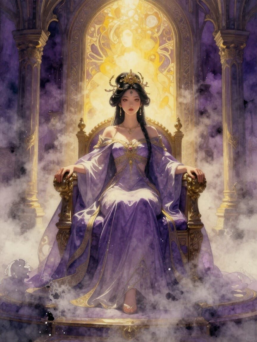 This image features a regal East Asian princess seated on her throne within a grand mansion. The artwork has a cinematic, atmospheric quality with volumetric fog, rendered in a watercolor style with deep colors.