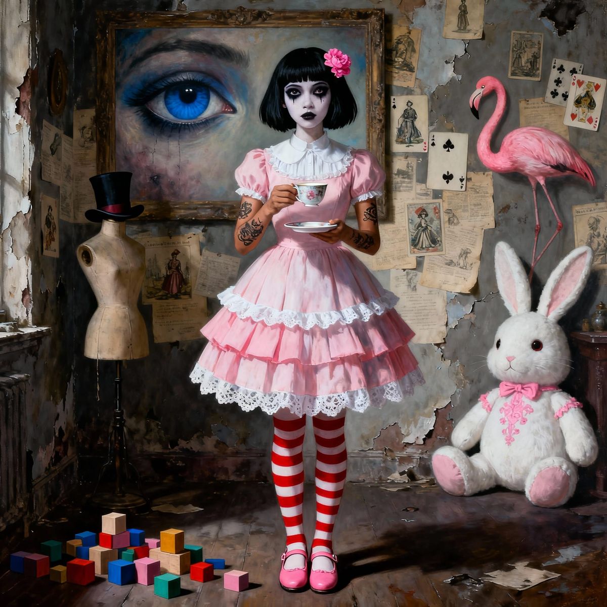This oil painting features a surreal portrait of a young Papuan woman in a whimsical dress, holding a teacup. The artwork evokes a dreamlike, unsettling atmosphere with intricate details.