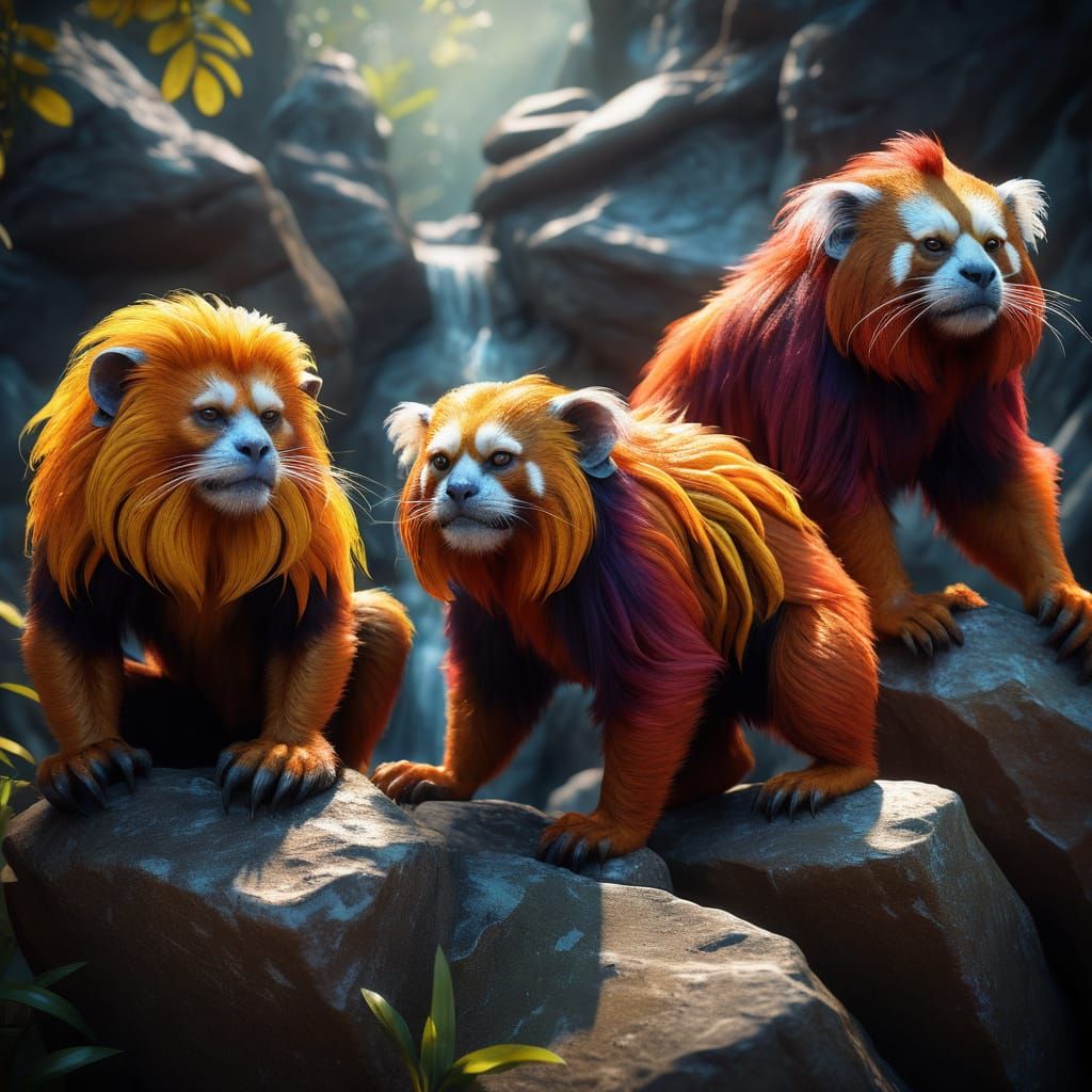 This image showcases a stunning, hyperrealistic creature design, blending the features of a golden Lion Tamarin, tiger, orangutan, and red panda. Set against a colorful, gradient background, the alien hybrid is posed on a rocky outcropping, bathed in dramatic side lighting. With intricate details, realis...