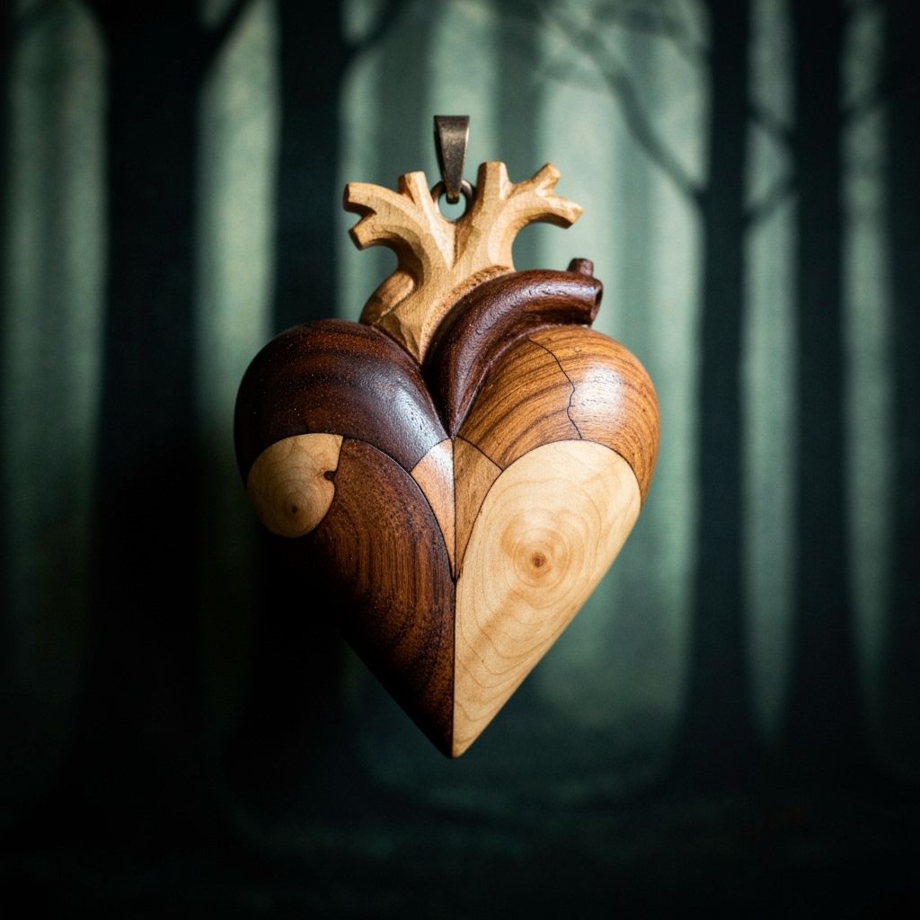 This image shows a wooden heart pendant in the Pre-Raphaelite style. The pendant is intricately carved from different types of wood, with a blurred forest background creating a sense of gothic mystery.