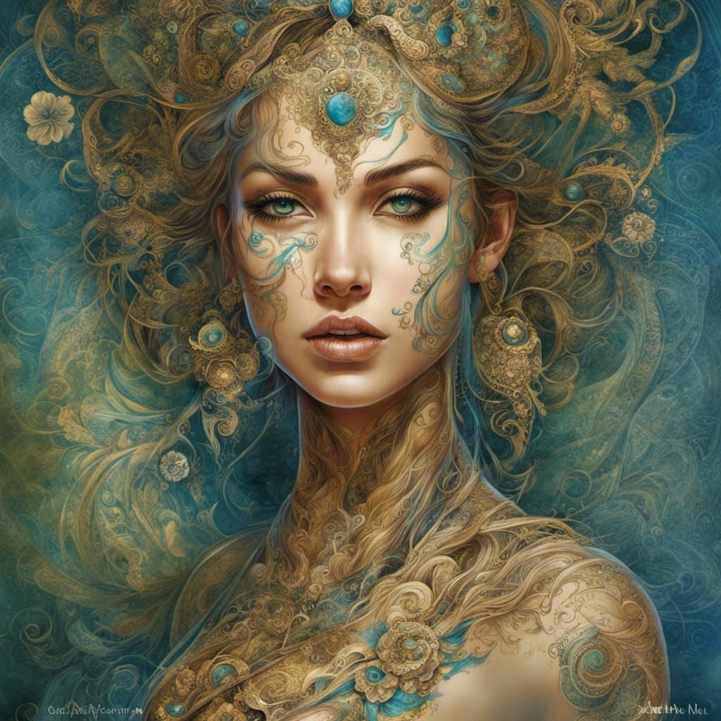 A digital painting of an Indian woman belly dancing with intricate mehndi bridal tattoos. The artwork features filigree details and complementary colors, reminiscent of fantasy concept art in 8k resolution.