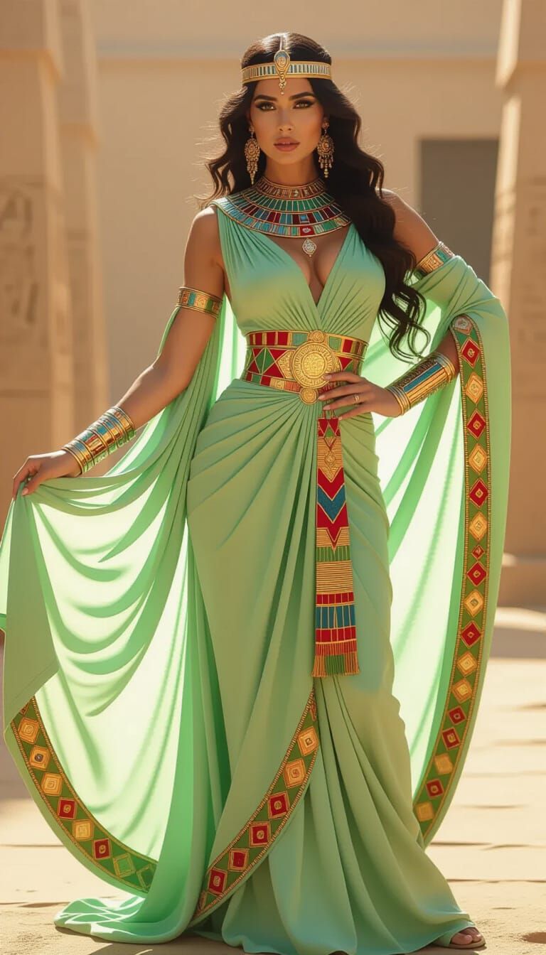 This image shows a curvy woman in an elegant Egyptian-style dress and jewels. The portrait features warm tones, film grain and a nostalgic feel, with a blend of symbolic expression and dynamic realism.