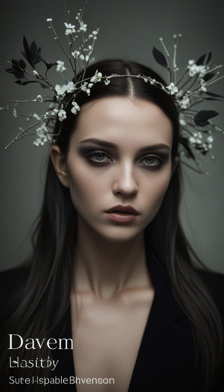 This image showcases a mystical woman with striking black warrior-inspired eyes and raven-black hair styled in a halo, adorned with silver twigs and dark angel wings. Captured in soft, natural lighting with a cool, silvery color palette, it highlights her unique, imperfect beauty.