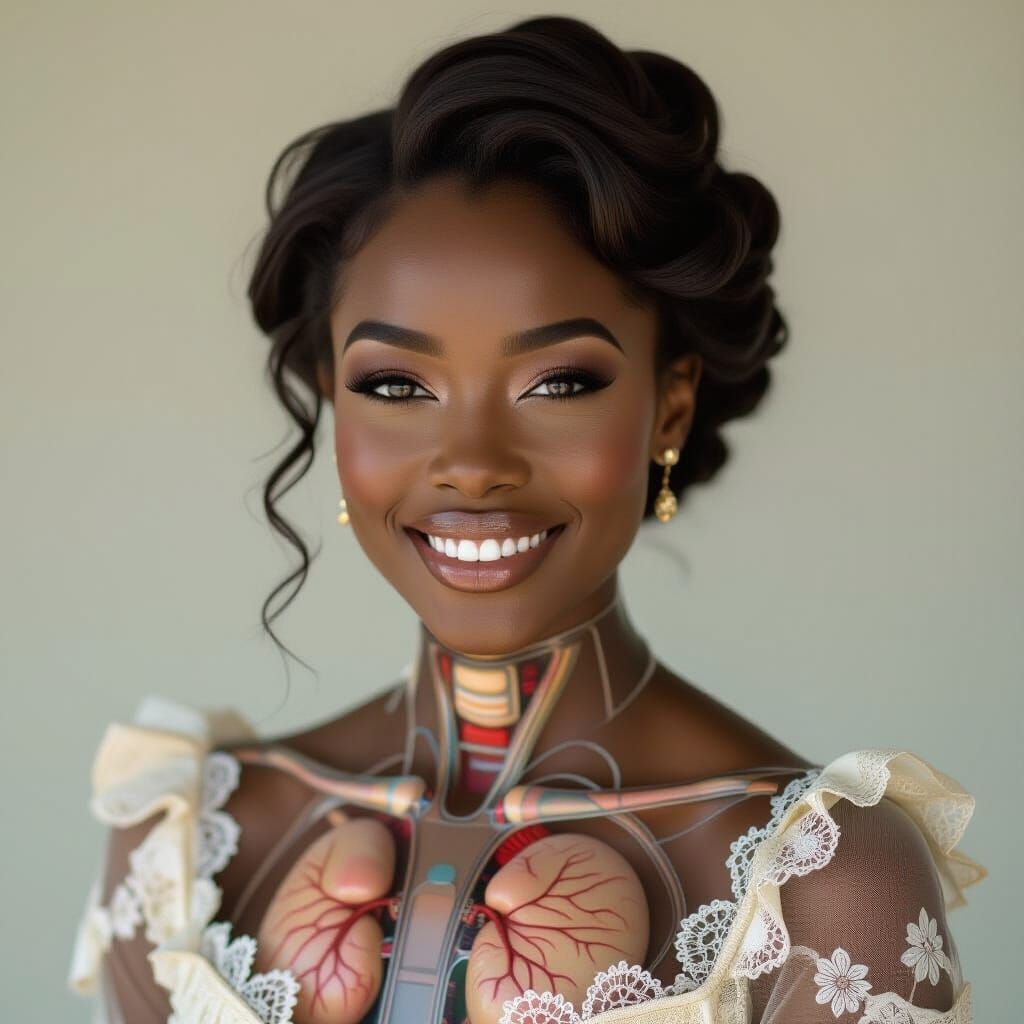 This image shows a beautiful, smiling dark-skinned woman with transparent, glass-like skin that reveals her inner organs. The cinematic image is set against a muted background with film grain.