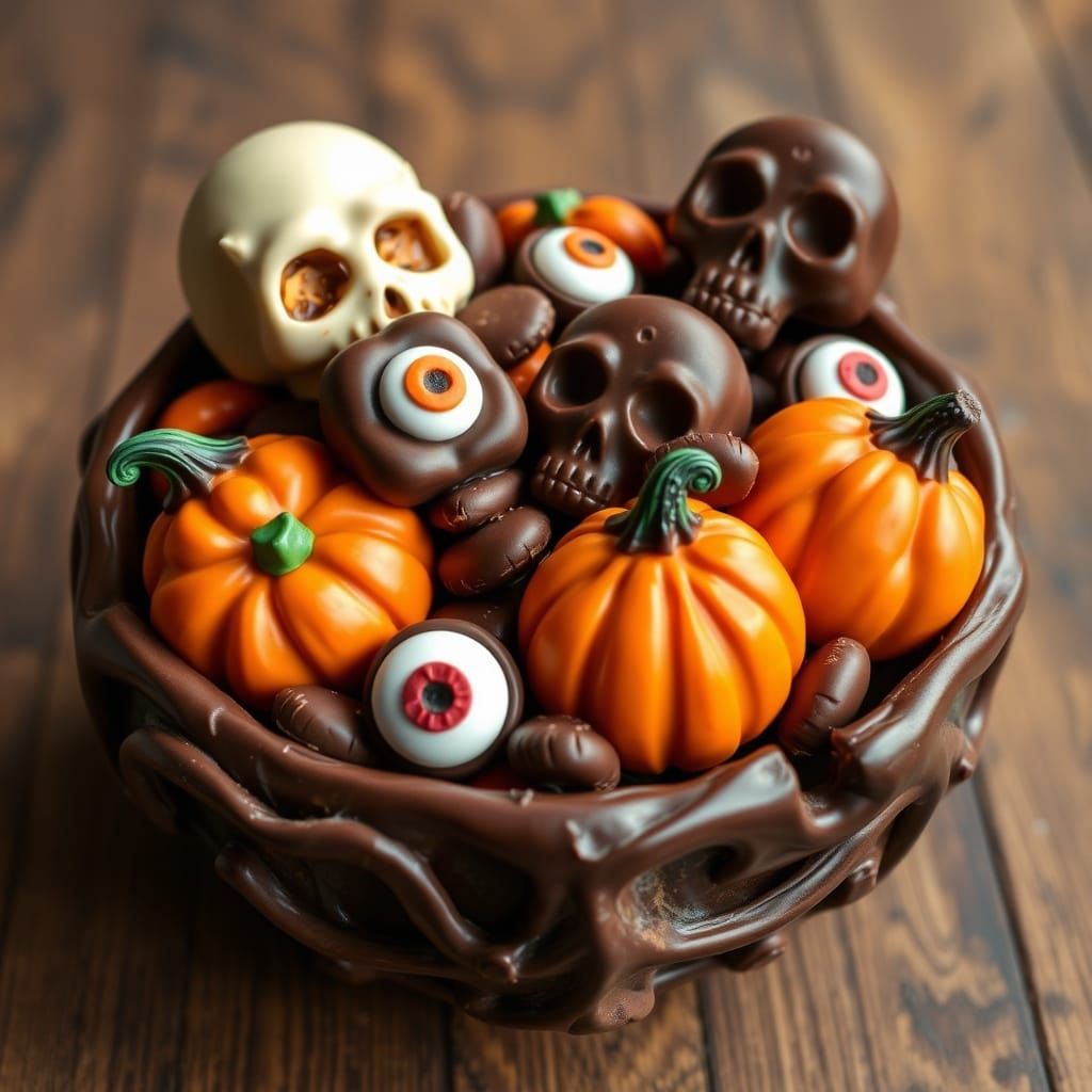 A creepy Halloween candy bowl overflowing with chocolate pumpkins, eyeballs, and skulls, perfect for trick-or-treaters.