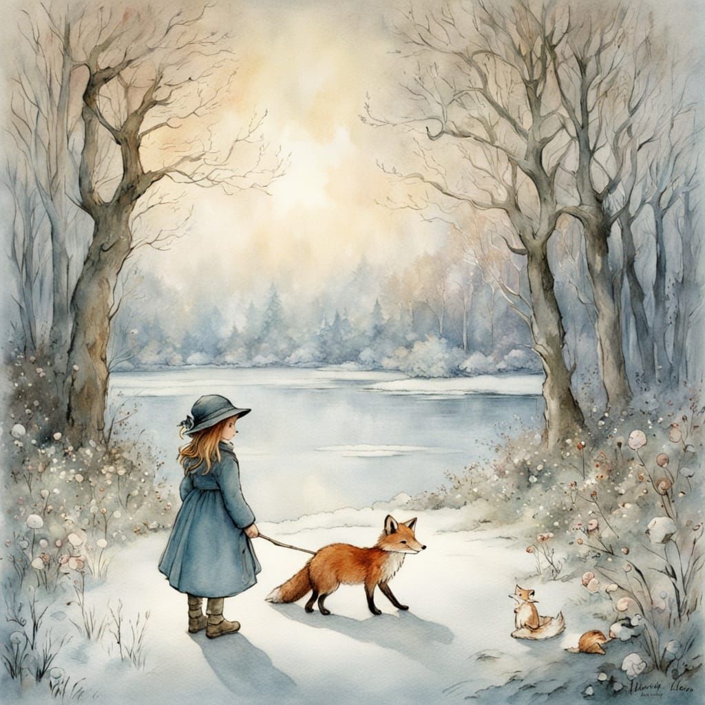 This watercolor illustration captures a serene winter scene of a little girl walking alone on a frozen lake, surrounded by a whimsical winter wonderland landscape and a loyal red fox by her side, evoking a sense of gentle magic and peacefulness.