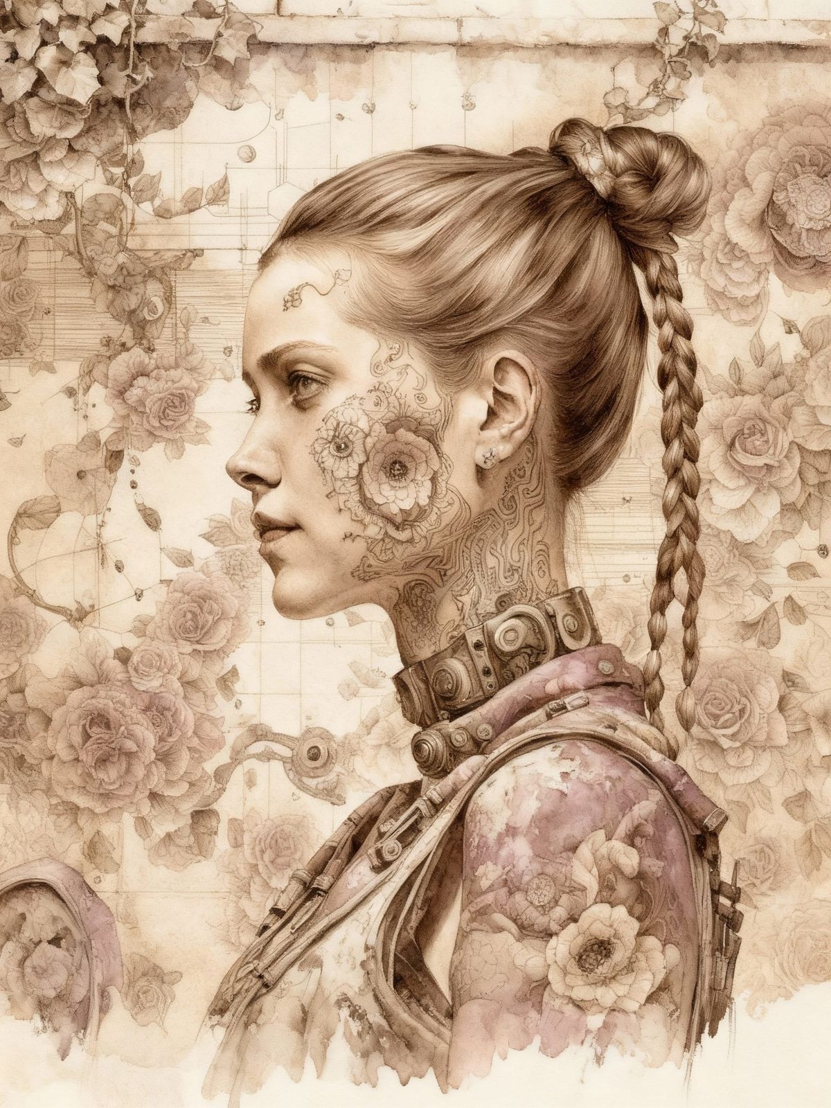 A limited palette water-colour (taupe/puce/sepia) portrait of a cyberpunk woman (pensive expression; elaborate floral tattoos; worn and battered street-wear with biomechanical elements; elaborate braided ponytail) standing in front of an intricate mural depicting roses and kudzu