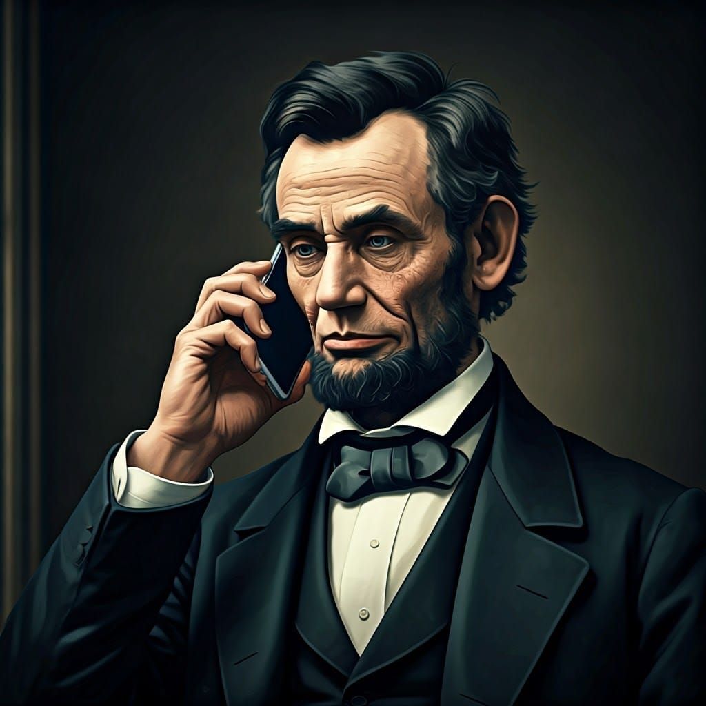 This image shows Abraham Lincoln holding and talking on an iPhone. The cinematic rendering features film grain, vignette, and dramatic, atmospheric lighting.