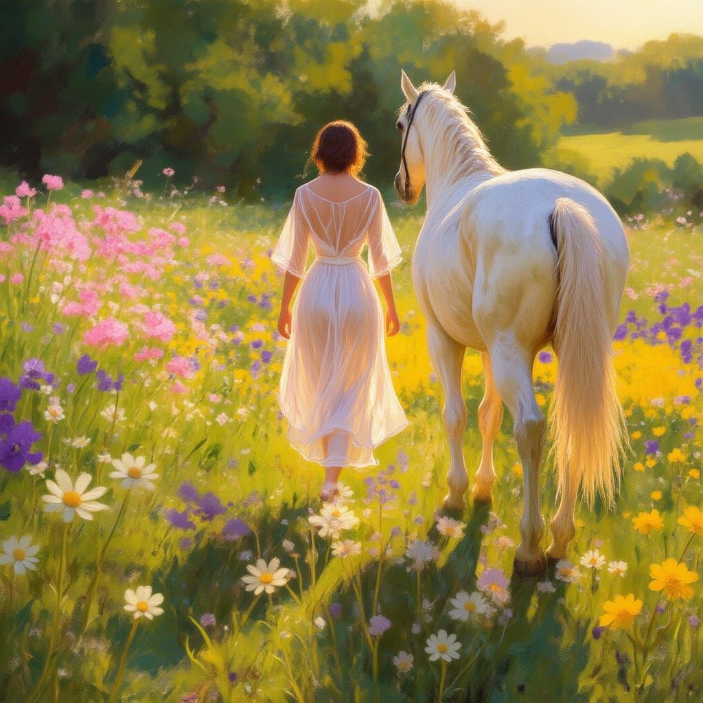 This image shows a woman and horse from behind, walking through a vibrant field of wildflowers during golden hour. The scene evokes a serene, painterly quality with soft focus and vivid colors.