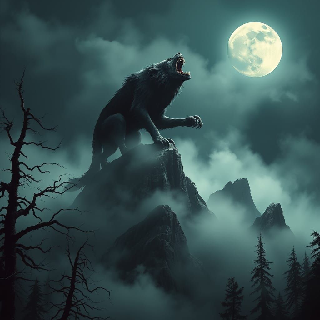 This haunting image depicts a massive werewolf standing atop a mist-shrouded mountain, howling at the full moon amidst a twisted, gnarled forest landscape with eerie fog and jagged peaks. The artwork combines elements of dark fantasy, haunting realism, and eerie lighting to evoke a sense of foreboding an...