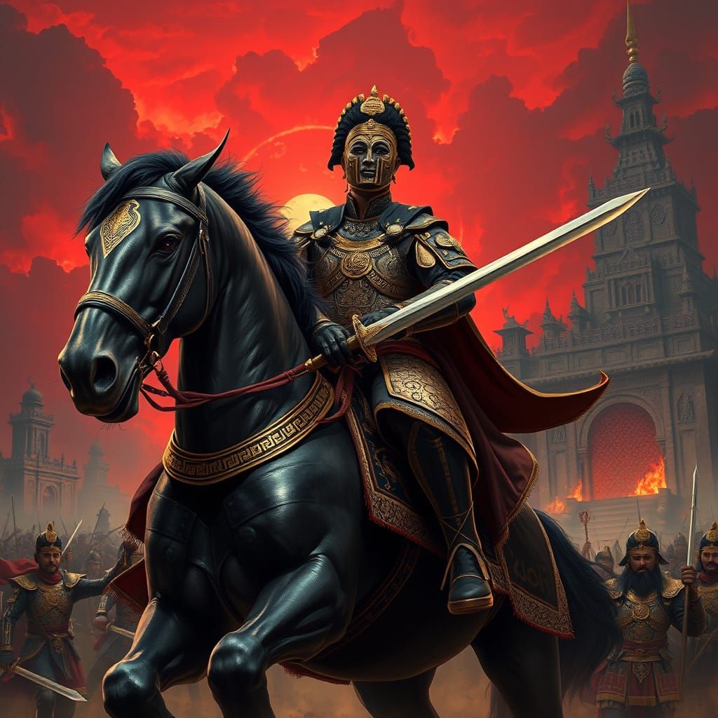 This dramatic painting depicts King Taksin the Great, clad in black armor with golden Thai patterns, riding a majestic warhorse as he leads the charge into the enemy's stronghold, set against a blood-red sky and an ancient wooden fortress.