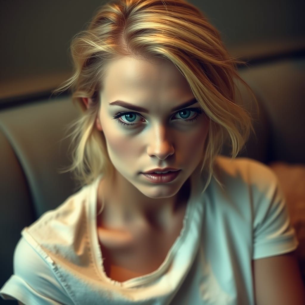 This image shows a captivating woman with golden locks and piercing blue eyes, exuding a sense of mystery and allure. Shot in extreme detail, reminiscent of high-end portraiture, with vibrant colors and cinematic lighting.