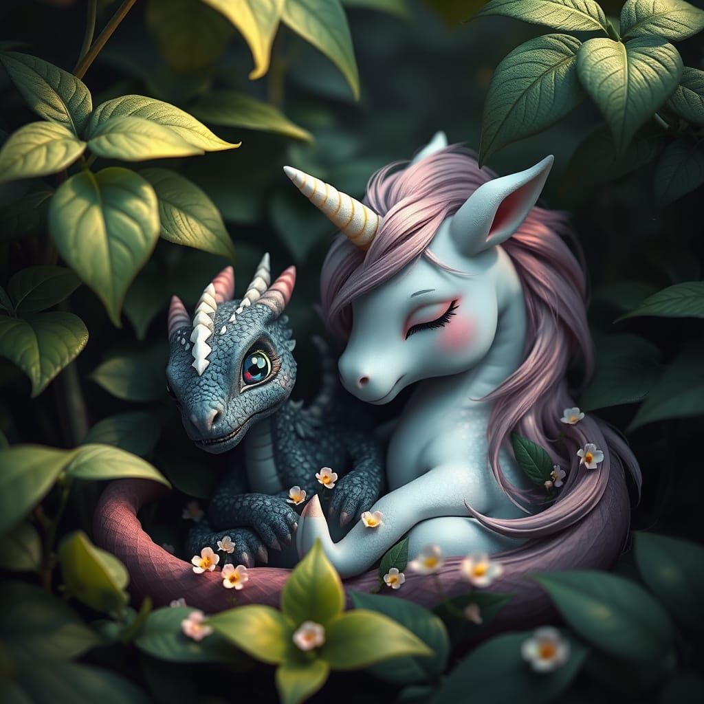 This image shows a baby unicorn and dragon as best friends in lush forest greenery. Tiny flowers echo their forms. Rendered in a detailed fantasy concept art style with deep colors.